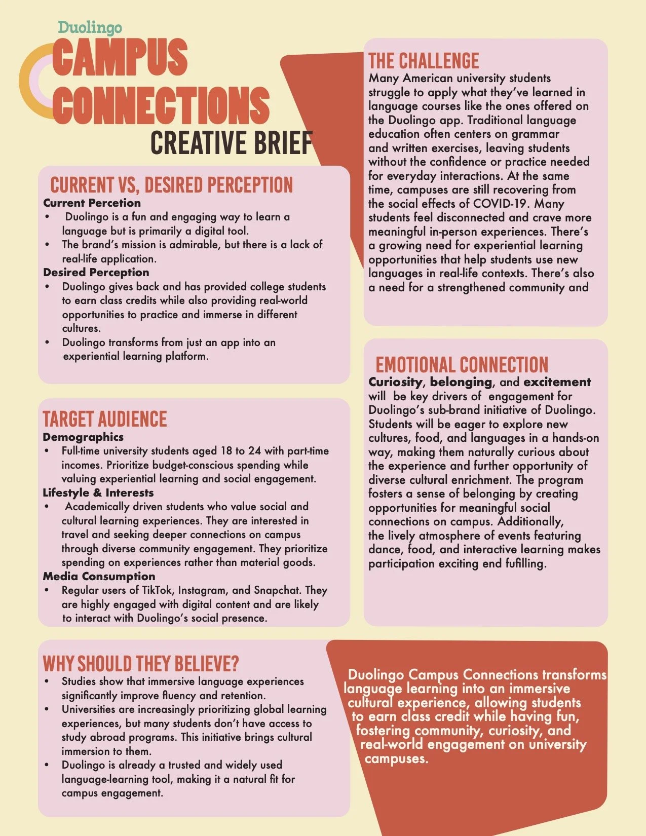 My passion for on-campus community advocacy, along with the diverse perspectives of my friends from many backgrounds, inspired the fictional campaign I created: Duolingo Campus Connections. This project focused on turning language learning into an immersive, real‑world experience that fosters belonging, intercultural curiosity, and engagement across college communities.